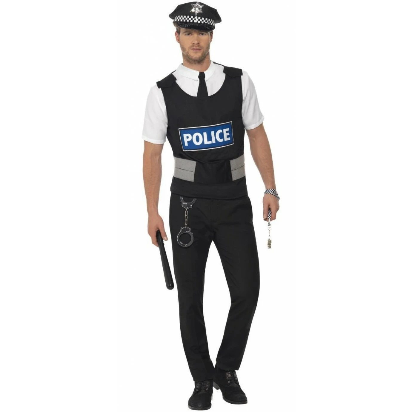 Costume includes vest, mock shirt, hat, and plastic handcuffs. Baton sold separately, trousers not included.