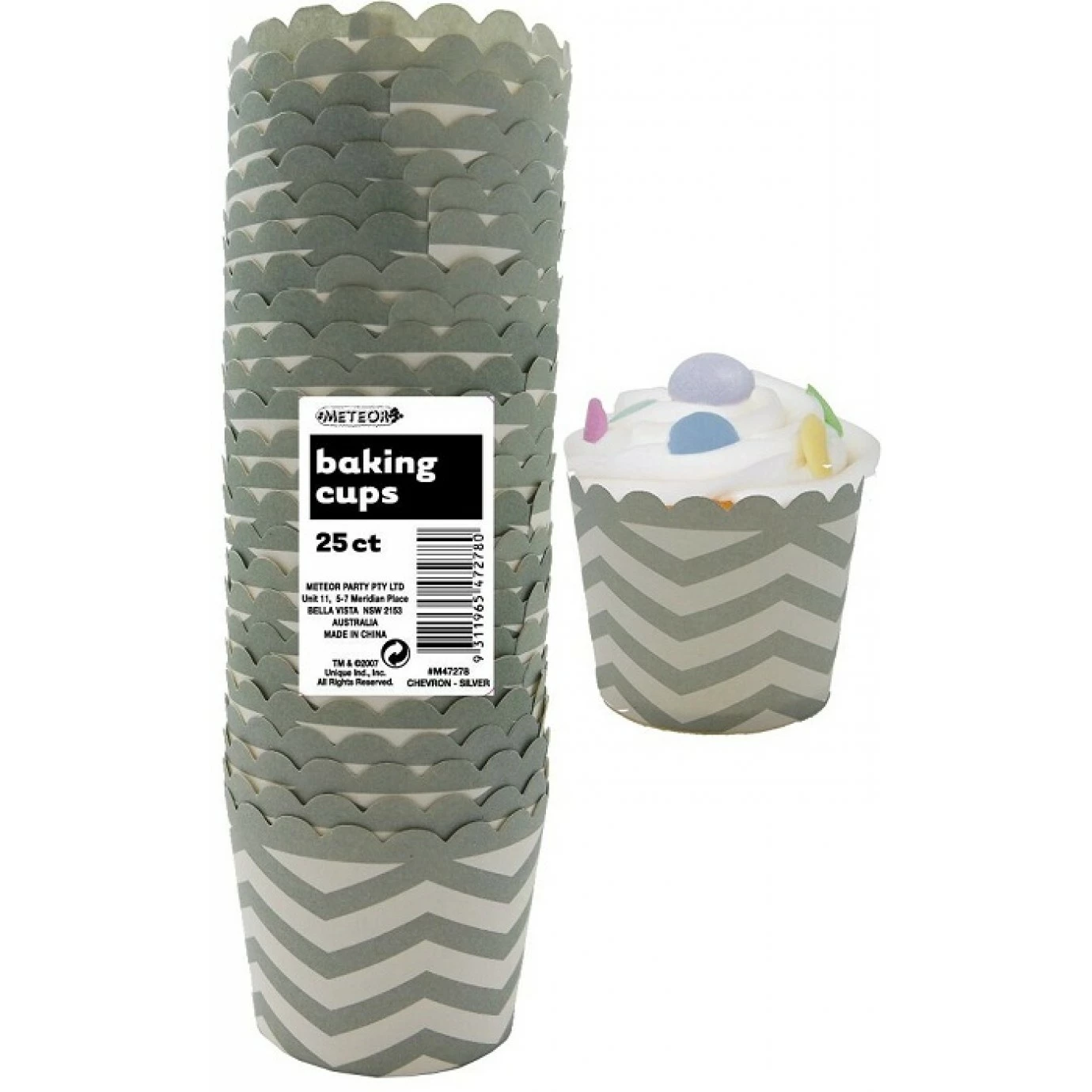 Pack contains 25 round paper baking cups. Each cup stands approximately 4.5 cm tall and has a diameter of 5 cm at the base. Easily matched with other tableware and decorations.