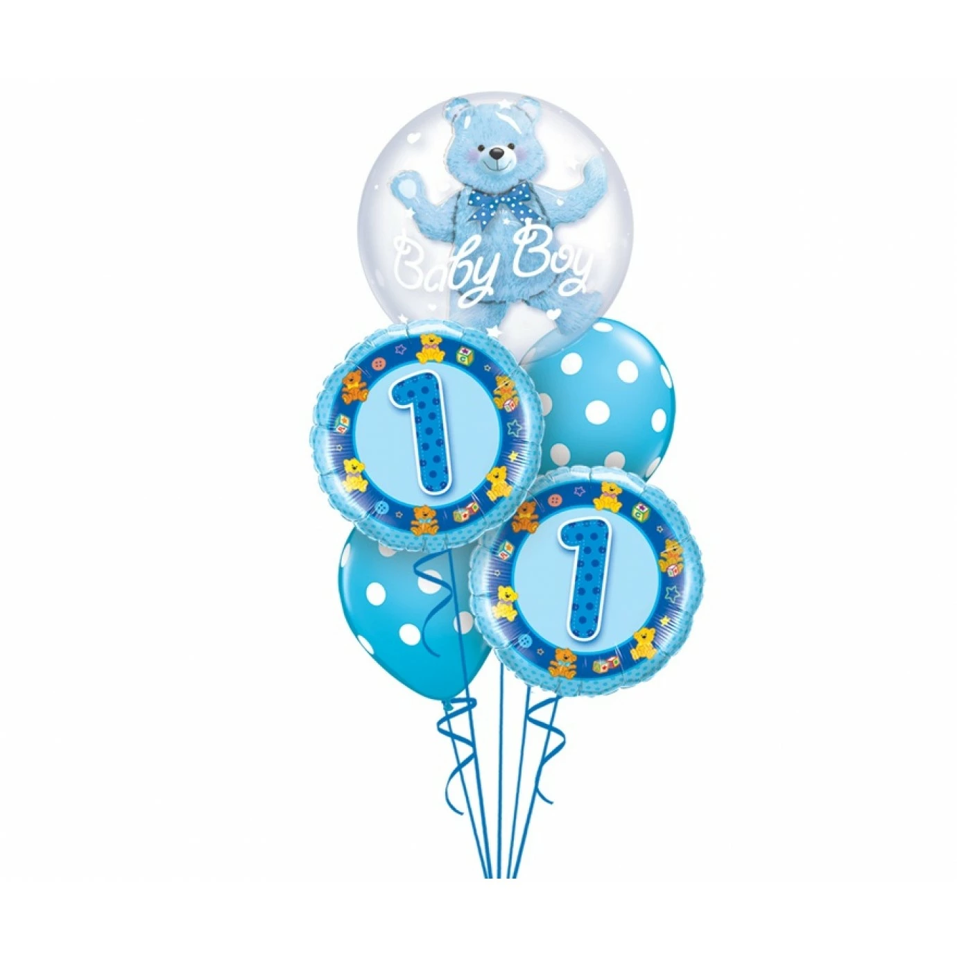 The second image shows this latex balloon in a bouquet combined with foil balloons and a double bubble balloon with blue teddy in a 1st Birthday celebration theme. For pricing on a bouquet like this one – call one of our stores!