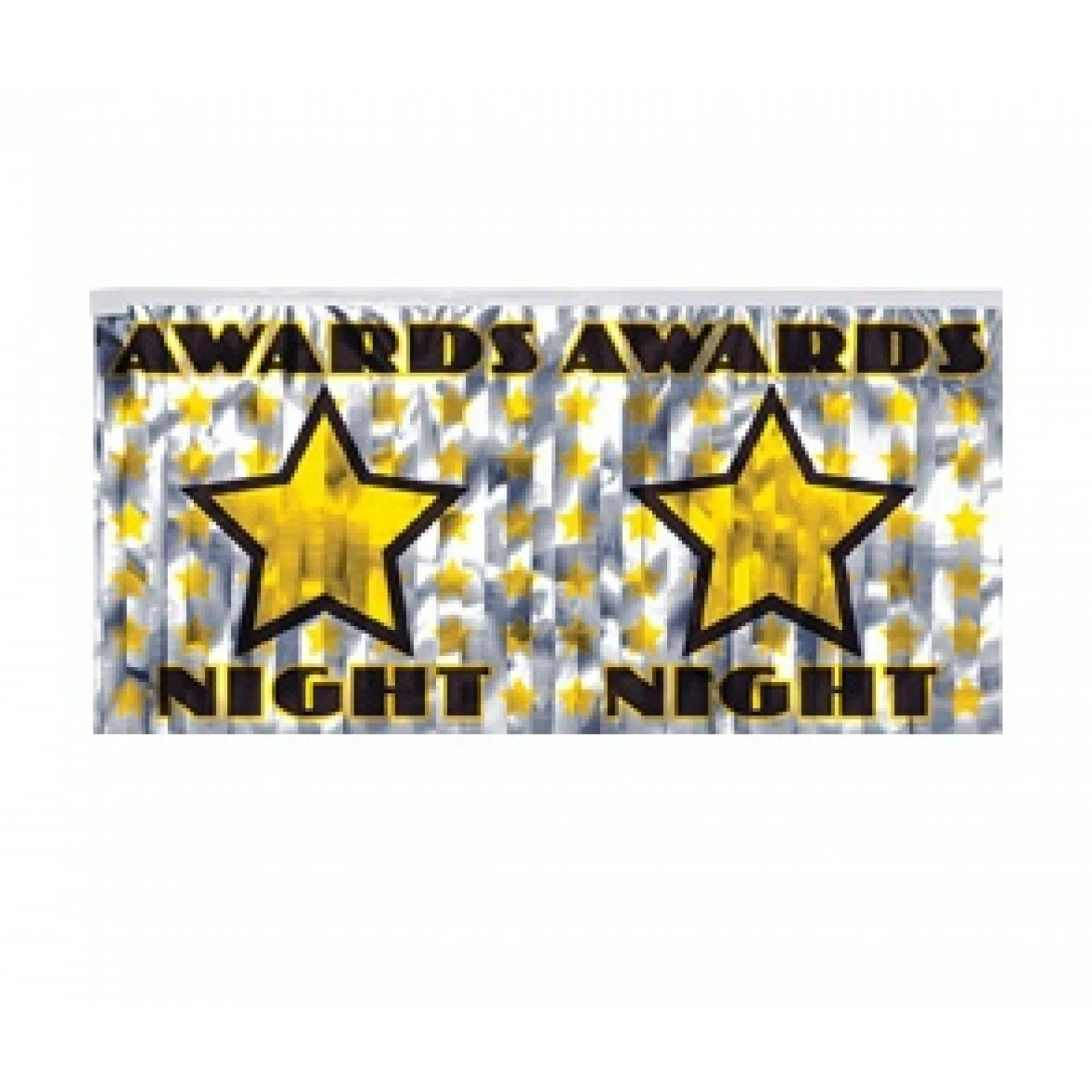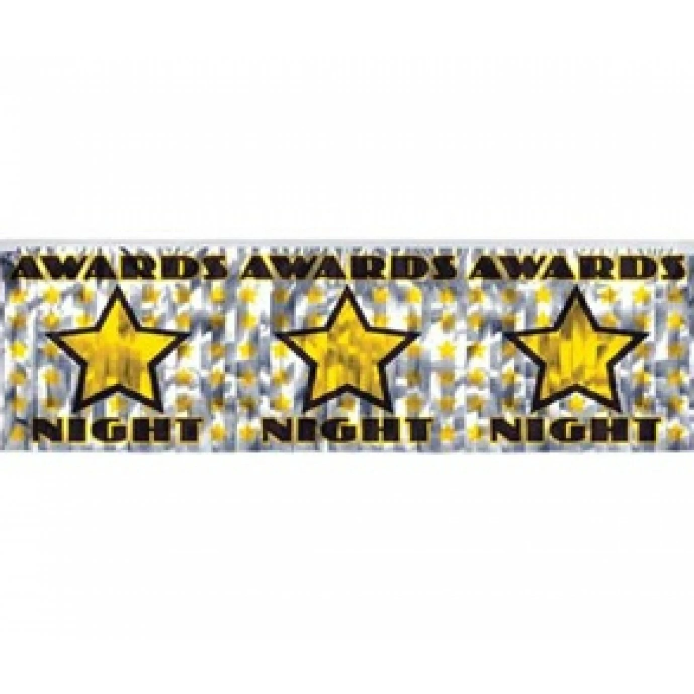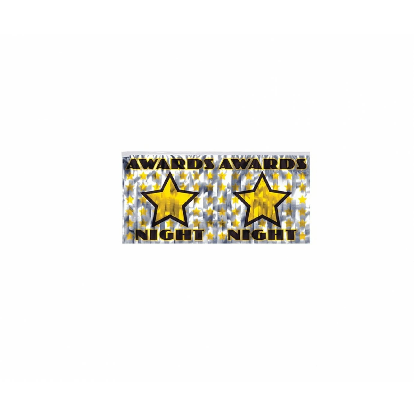A silver metallic fringe banner with three gold stars and the words “Awards Night” printed in black and gold.