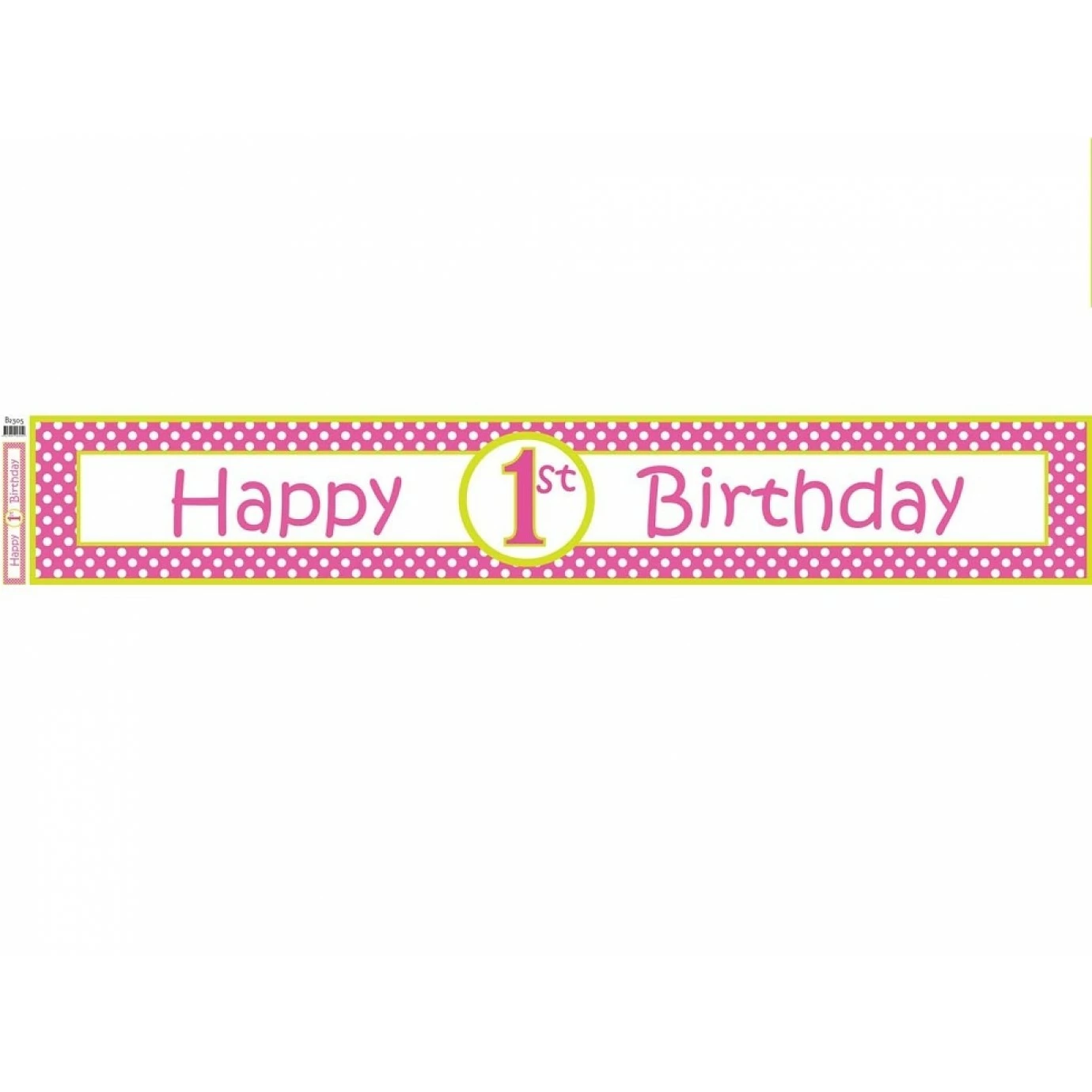 A white paper banner with ‘Happy 1st Birthday’ in a pink and white polka dot design.