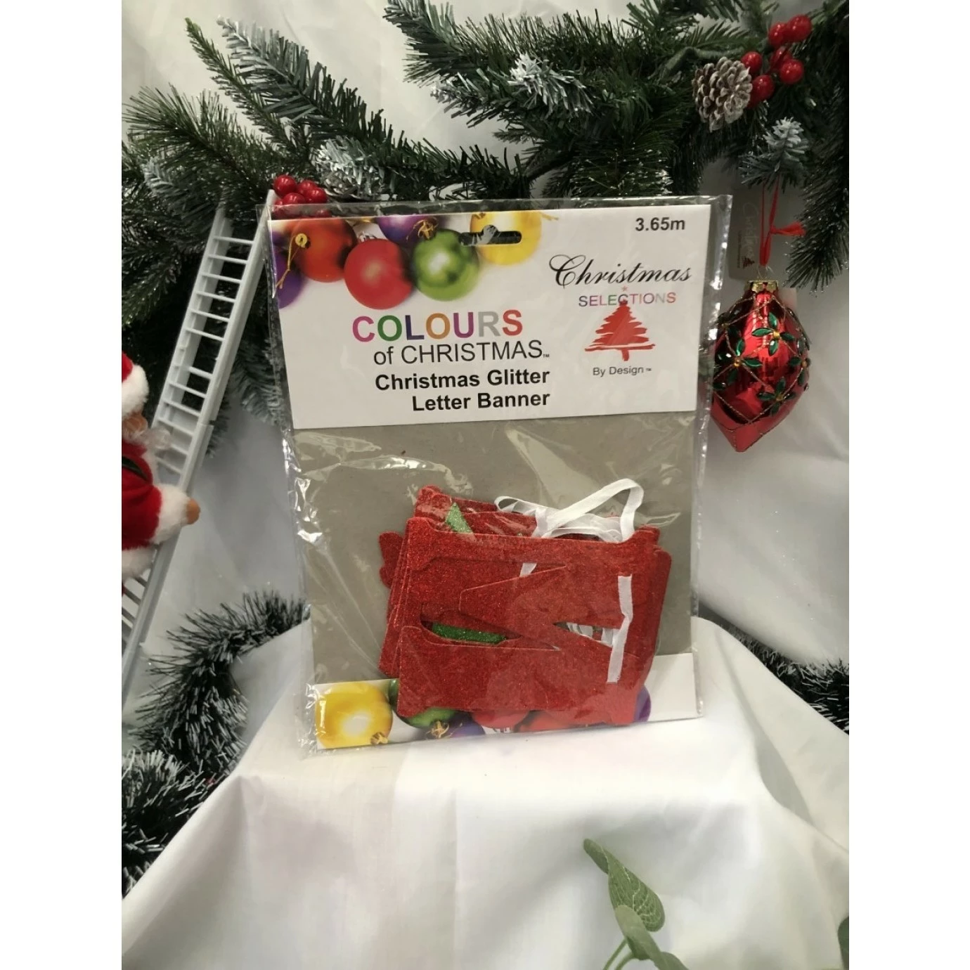 Get any venue ready to celebrate Christmas with this glitter “Merry Christmas” banner featuring green glitter tree.