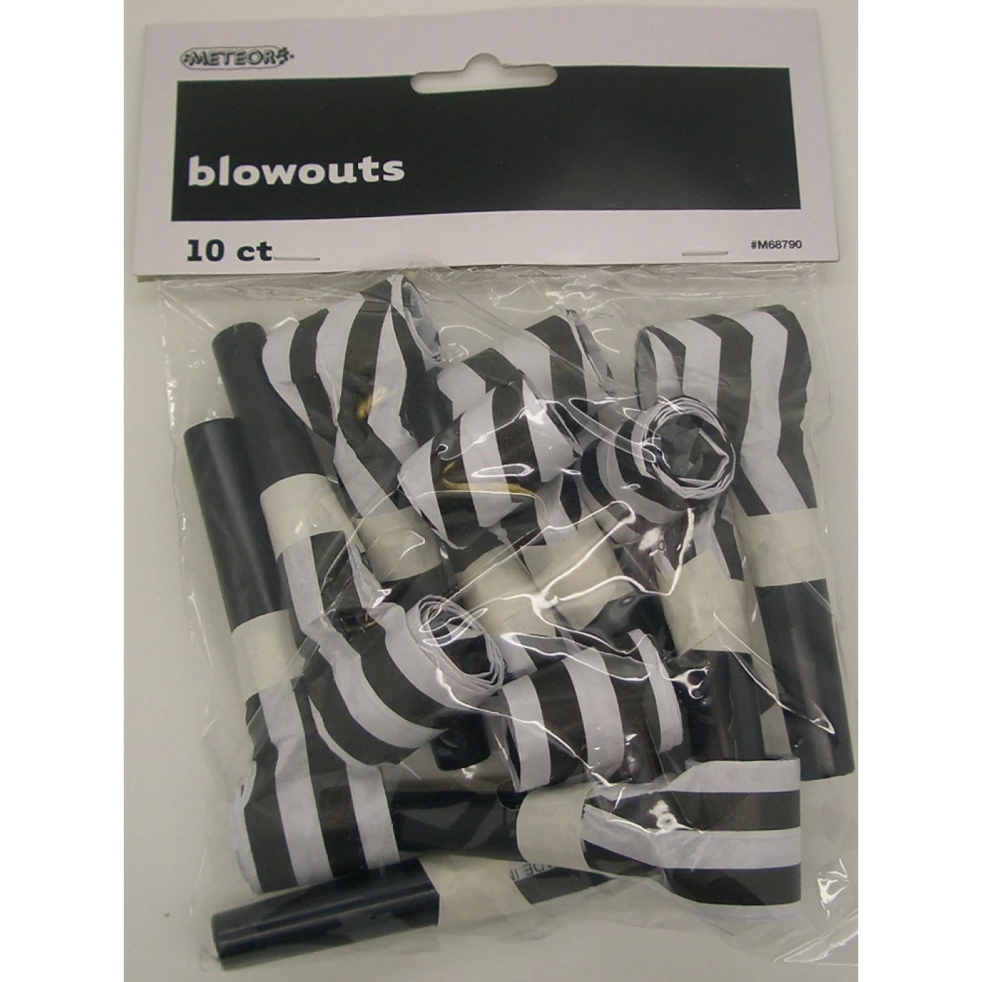 Pack contains 10 blowout toys with a mix of chevron and striped design pattern. The trumpet is made from plastic with a paper blowout attached. The dimensions below are made with the blowout curled up.