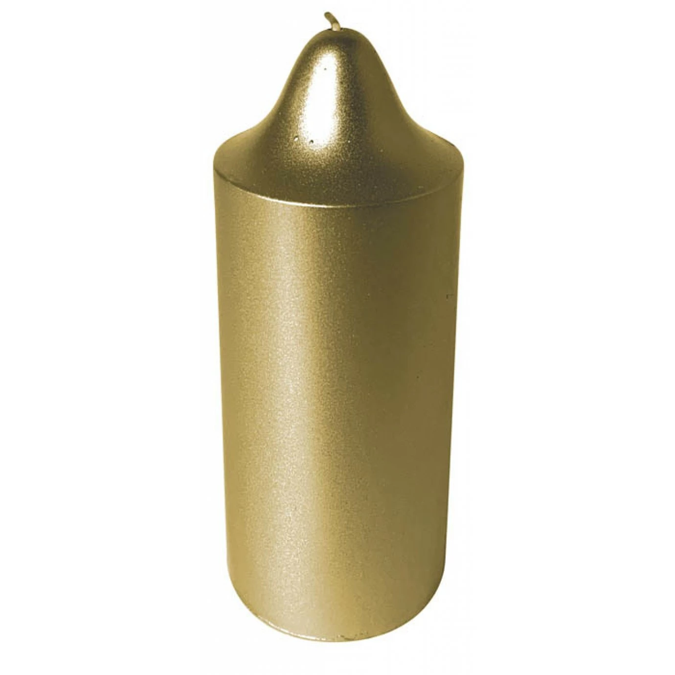 Pillar candle with gold look surface measures approximately 18 cm tall.