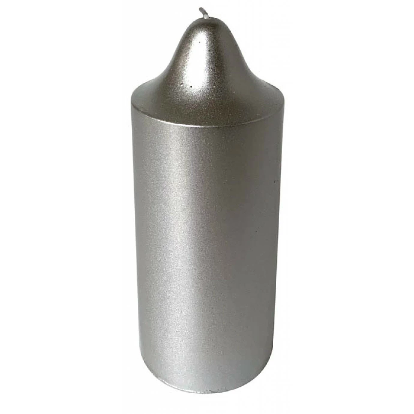 Pillar candle with silver look surface measures approximately 18 cm tall.