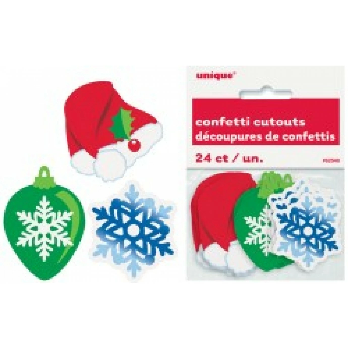 Pack contains 24 individual cardboard cutouts each measuring approximately 5.5 cm tall. Cutouts include Christmas ornaments, snowflakes and Samta Hats.