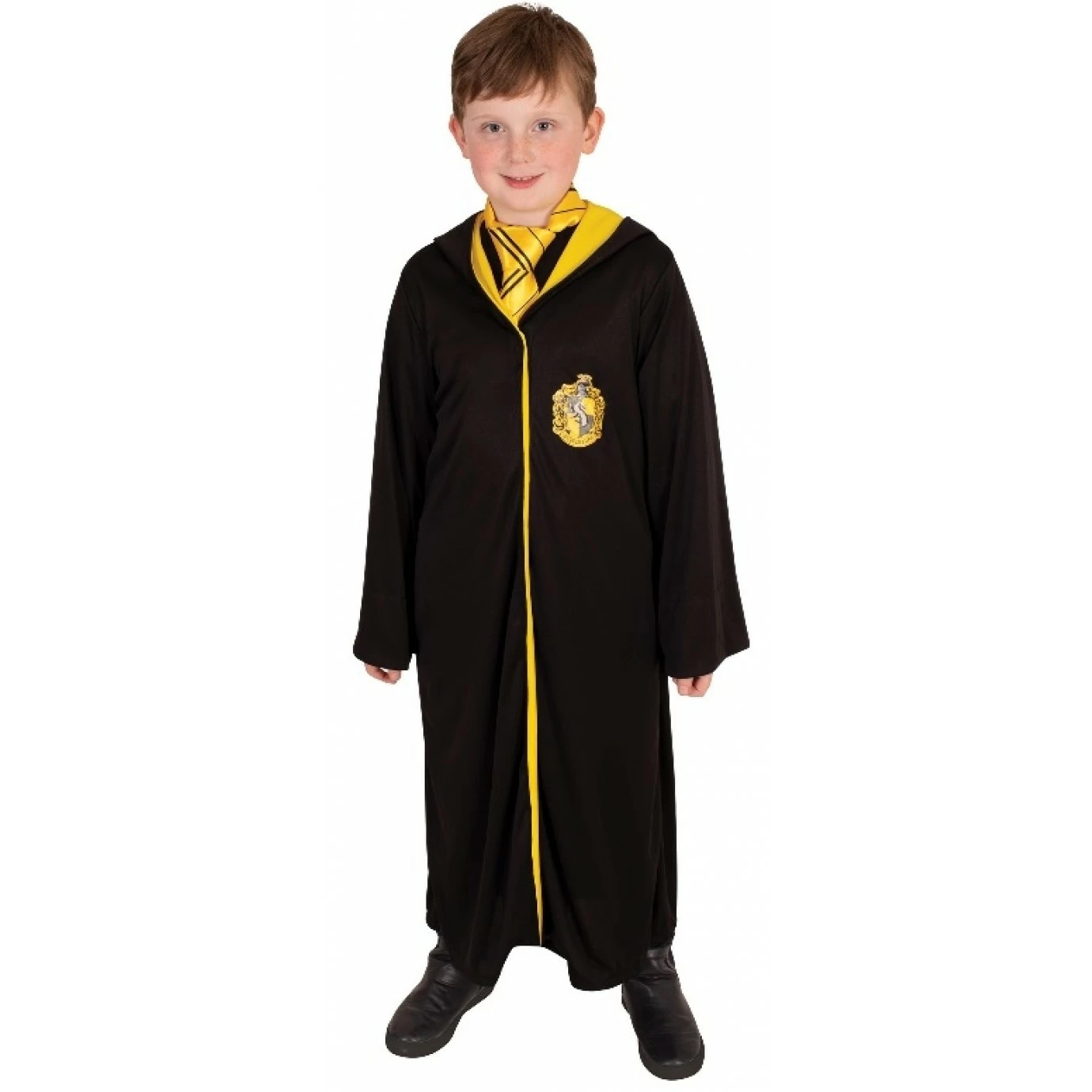 Costume consists of a hooded robe with clasp, featuring the Hufflepuff badger emblem on the front.
