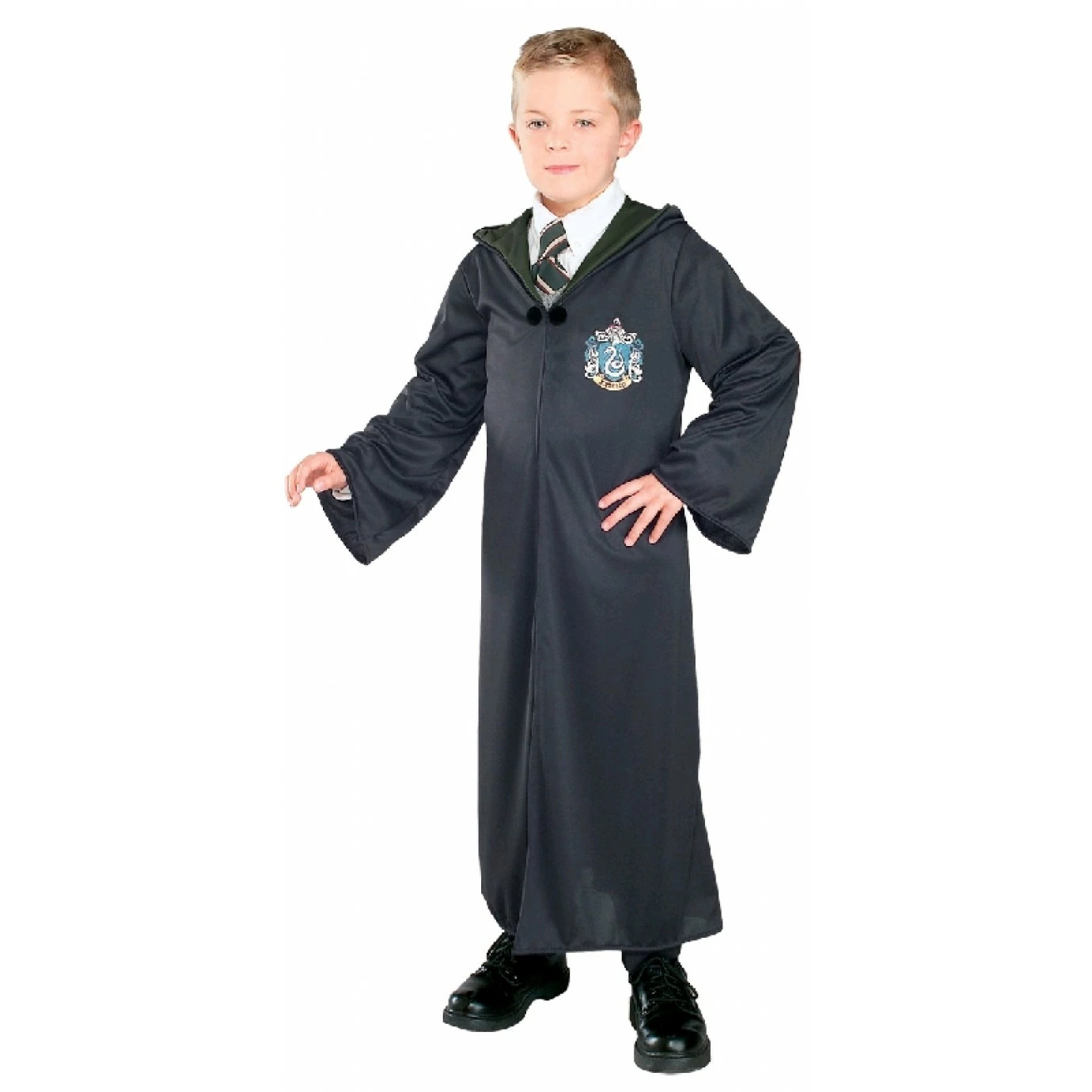 Costume consists of a hooded robe with clasp, featuring the Slytherin serpent emblem on the front.