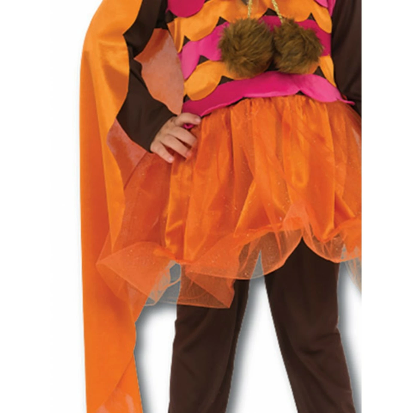 Costume includes top with layered fabric to create a ‘feathered’ effect, skirt with tulle fabric overlay, attached hood with owl features and drawstring with pom poms.