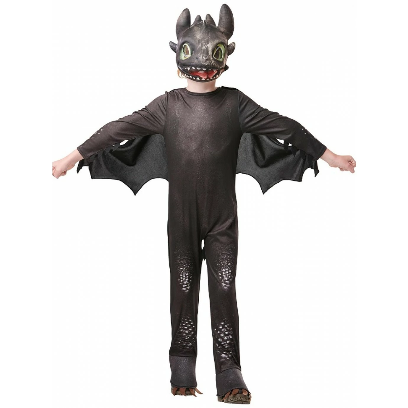 Costume includes a scale printed black jumpsuit with detachable wings and soft plastic mask.