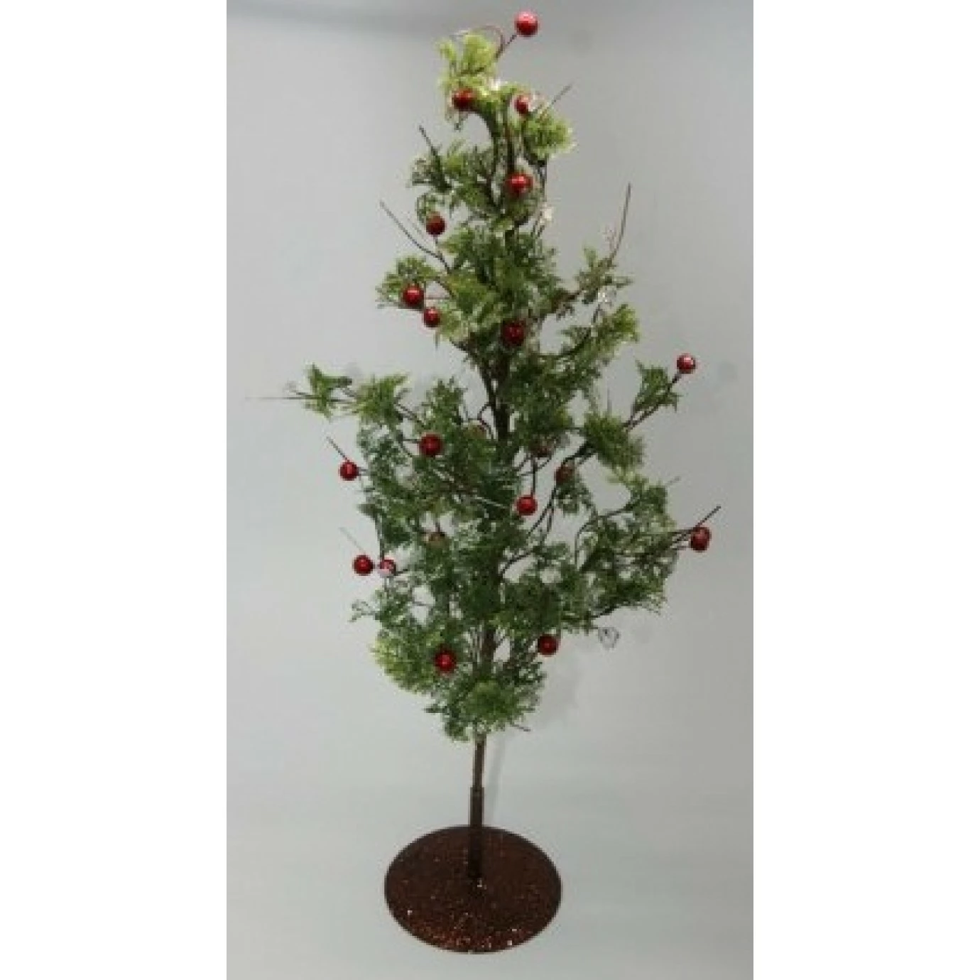 Made with a metal stand and wire core with plastic synthetic leaves with red berries and faux jewels.