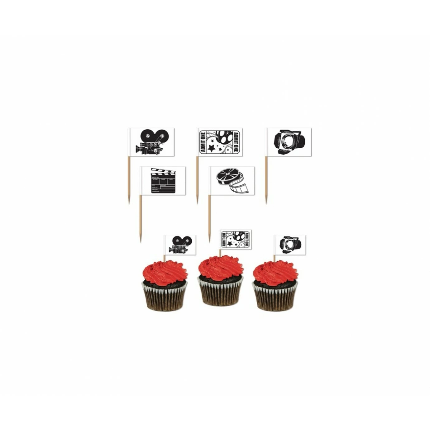 The flags have a print of different movie themed items such as a light, roll of film, admission ticket, clapboard and movie camera. Could also be used as cupcake toppers.