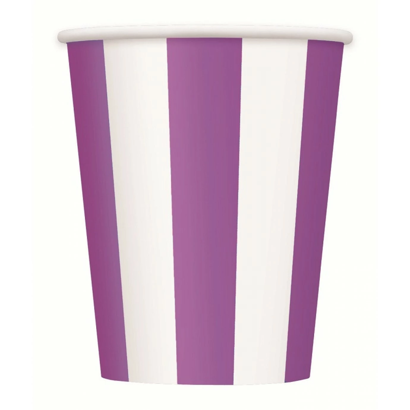 Pack contains 6 disposable paper cups with a stripe design. Each cup has a 355 ml volume and measures approximately 11 cm tall.