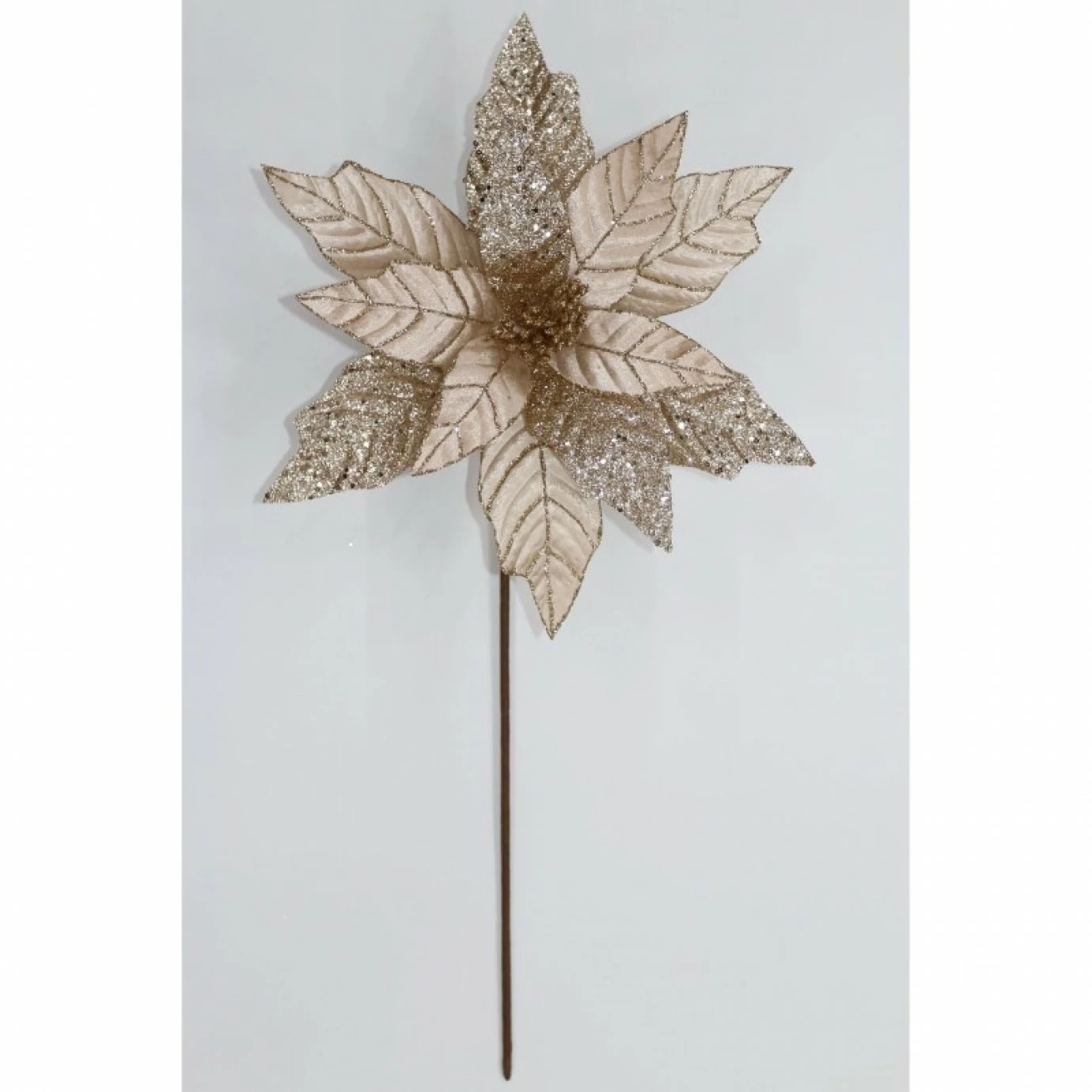 This flower has a plastic stem and fabric leaves with glitter detailing.