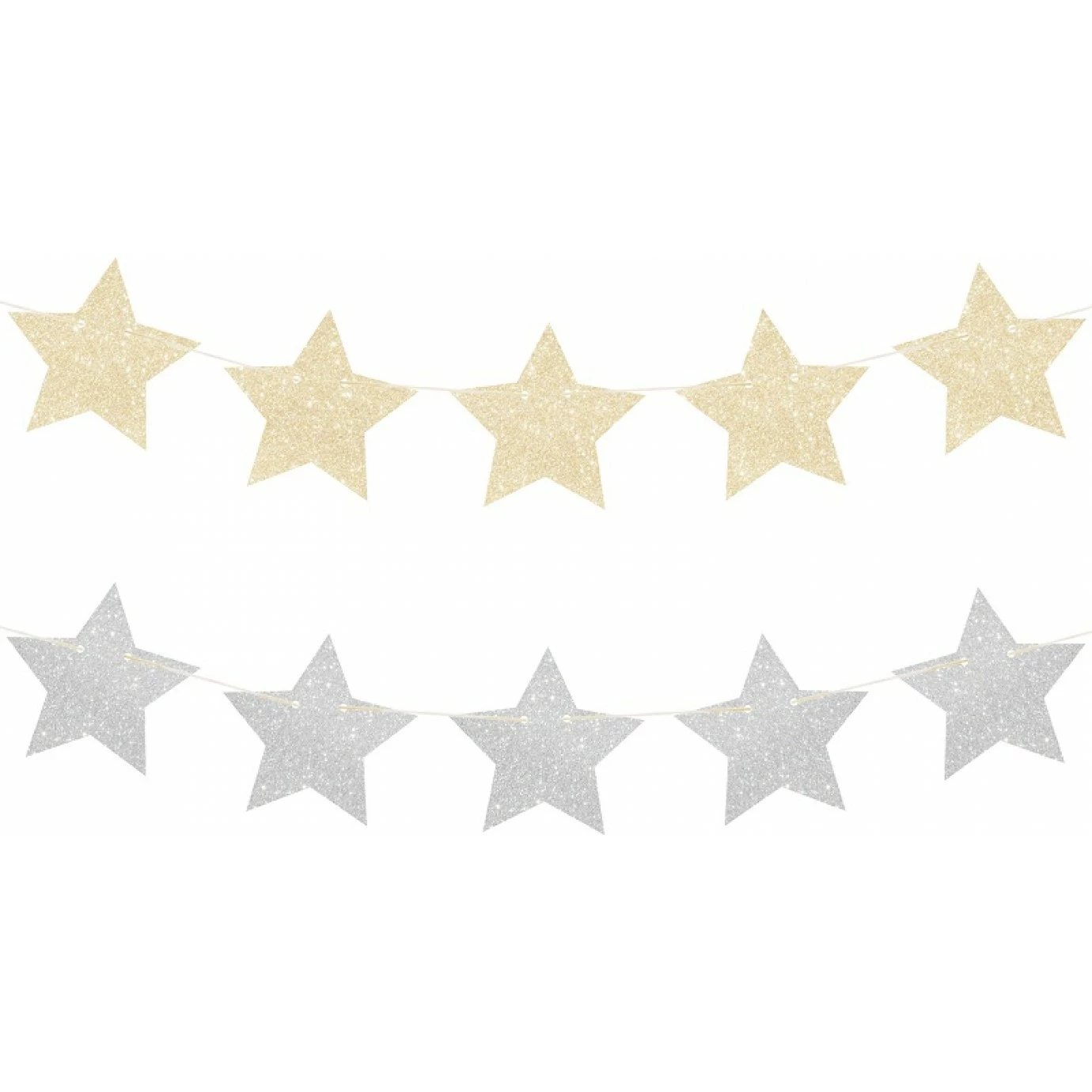 Garland is made of 15 pieces of cardboard in cutout star shapes with glitter coating. Each star cutout is silver on one side and gold on the other. Garland comes with a string to thread through the pieces, allowing you to arrange them with matching colours on one side, or alternating between gold and silver. String is white colour and measures approximately 3 metres long. Each cutout measures approximately 8 cm wide and 8 cm tall.