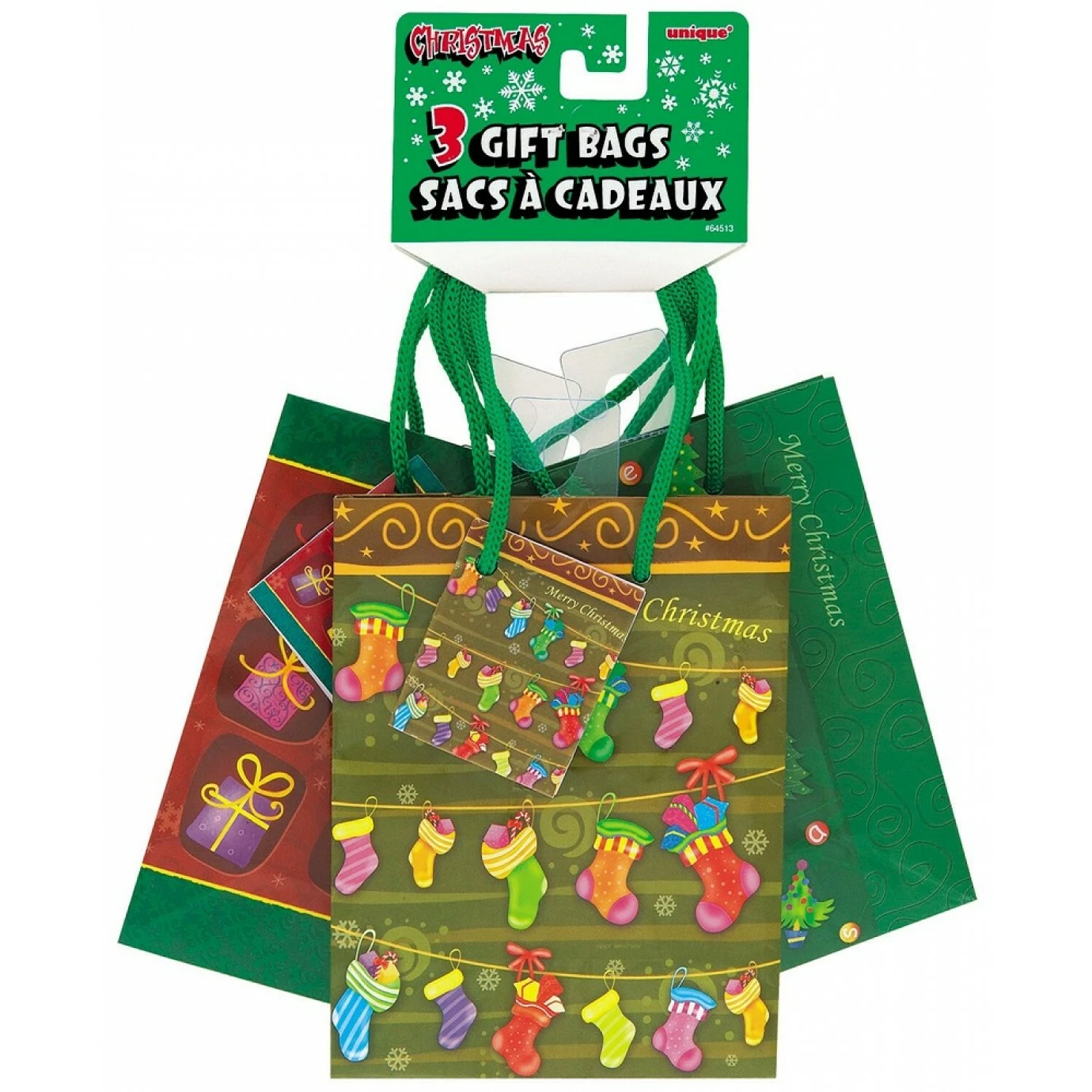 Made from a sturdy wax paper, pack includes three small gift bags with attached cord handles. These bags also feature a small cardboard gift tag attached to the handle.