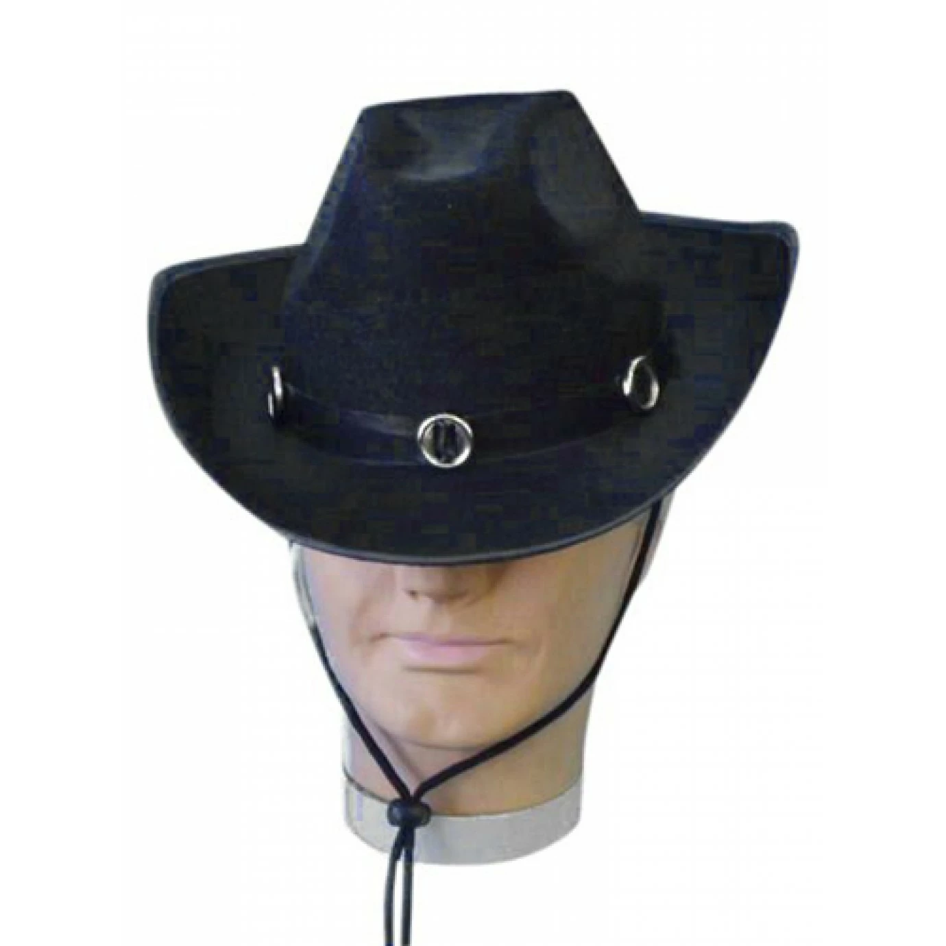 Cowboy hat is made from stiff Feltex material with attached accessories and draw string. One size fits most adults.