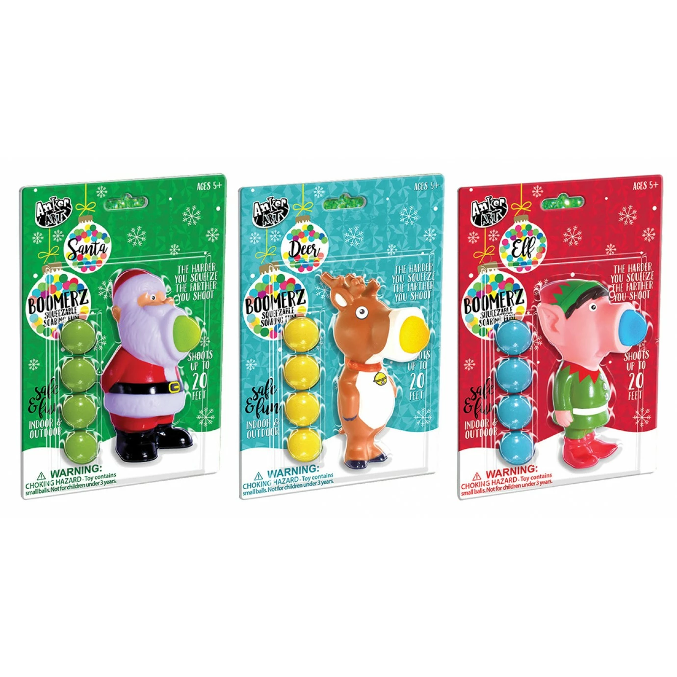 Fun for kids at any Christmas event! Holiday Boomerz shoot a plastic ball when you squeeze them! Available in assorted Christmas themed designs.
