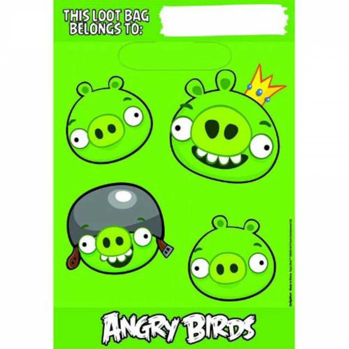 Pack contains 8 plastic lolly bags with pre-cut handles. Each bag features a print with an Angry Birds design. Each bag measures approximately 23 cm long and 17 cm wide.