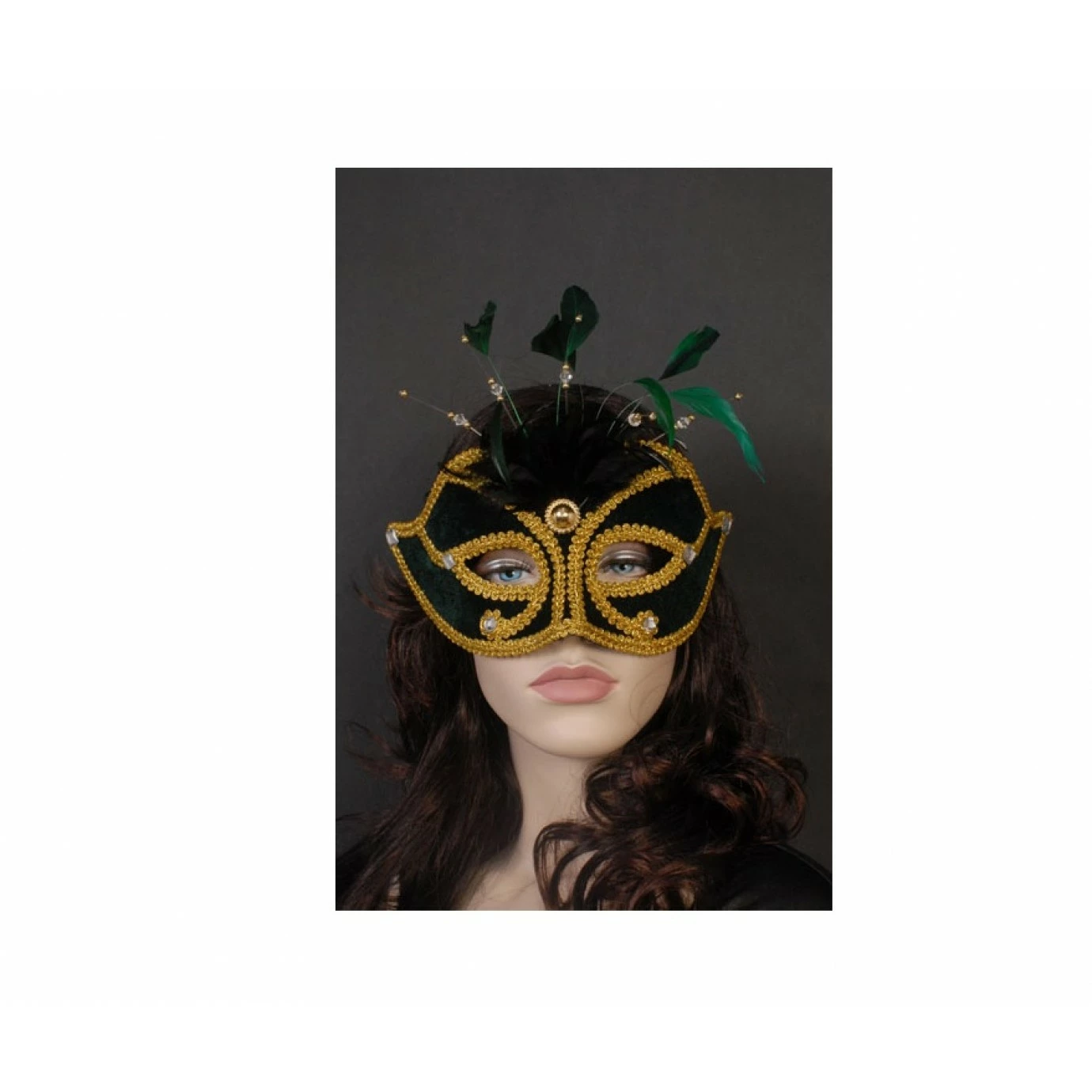 Green velour mask with gold trim around face and eyes and clear gems. Gold centrepiece on forehead from which emanates green and black feathers. Mask is attached with a black headband.