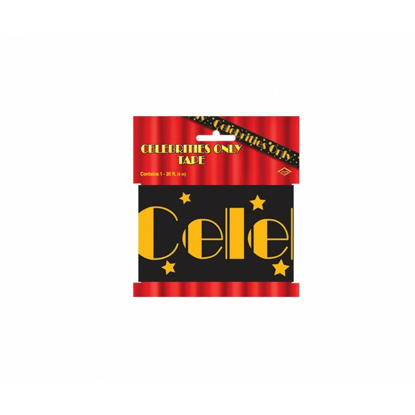 A black plastic tape which has the words “Celebrities Only” in gold letters. Note that this tape is not adhesive.