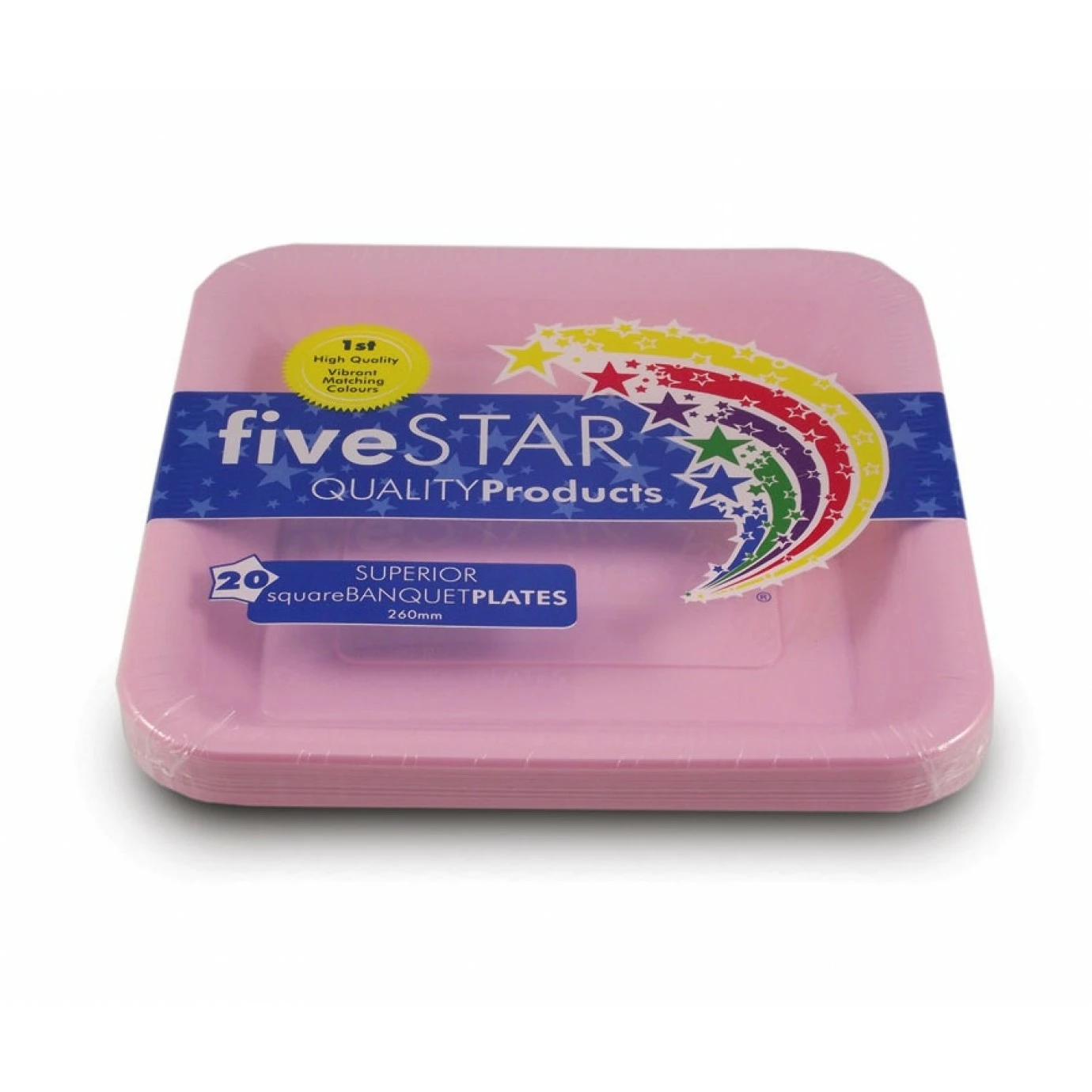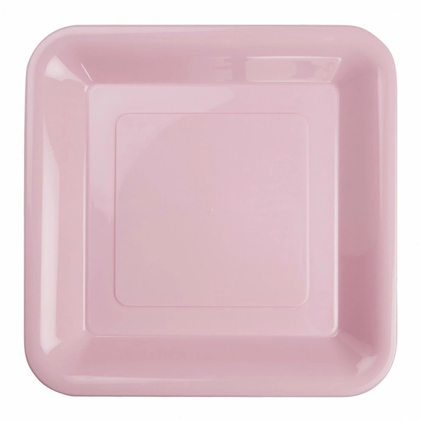 A set of 20 hard plastic disposable banquet size plates. Each plate measures approximately 26 cm by 26 cm. Match these plates with our range of colour tableware for stunning party table settings.