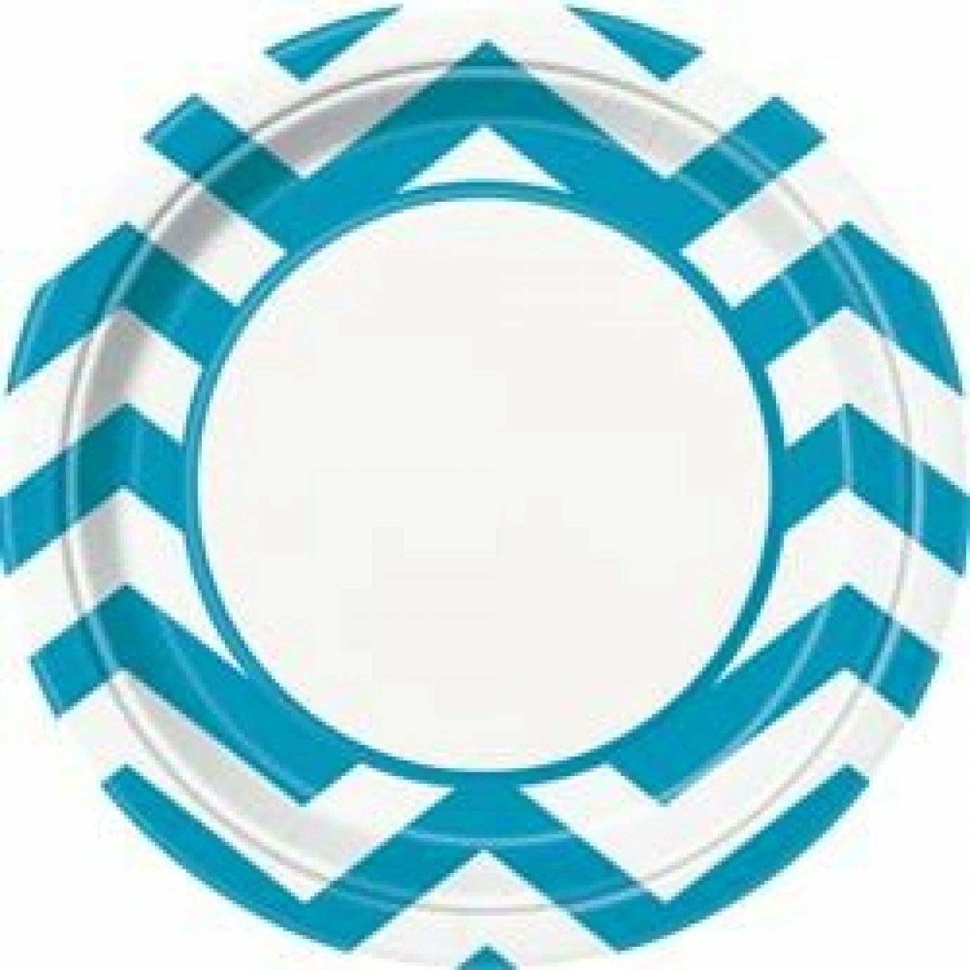 A set of party plates featuring a bold chevron design in Caribbean blue and white.