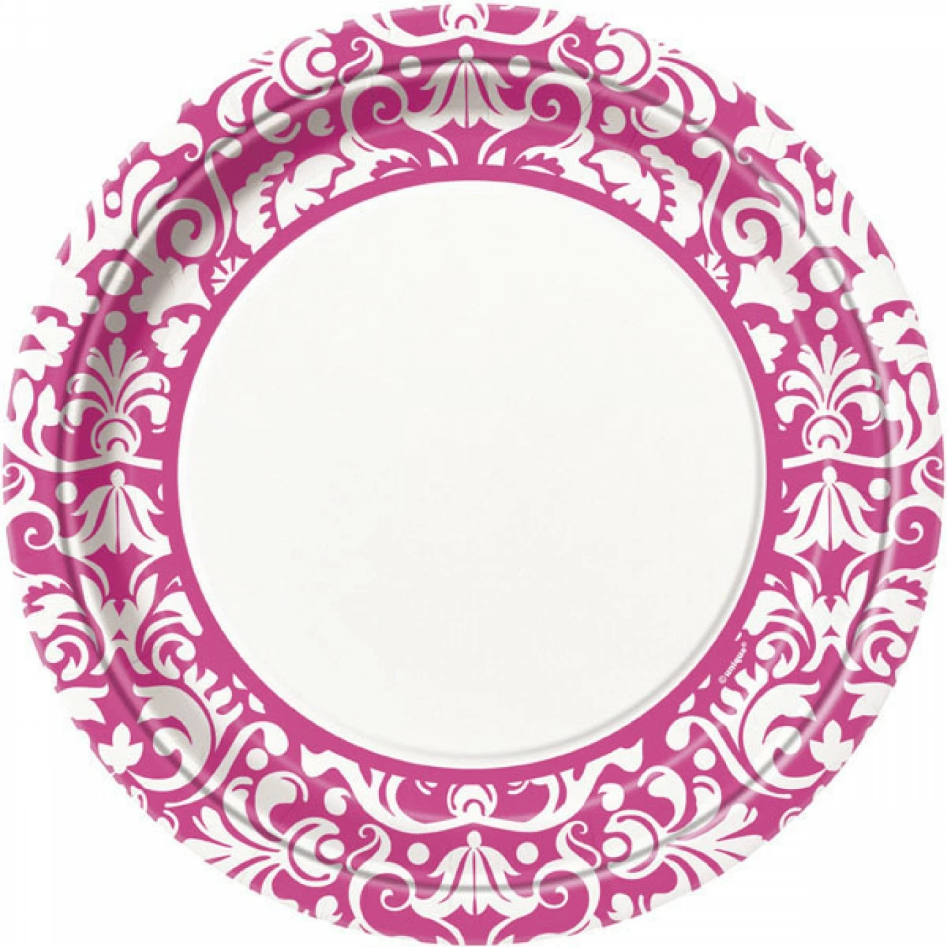 Pack contains 8 disposable paper plates featuring a pink damask print around the edges.