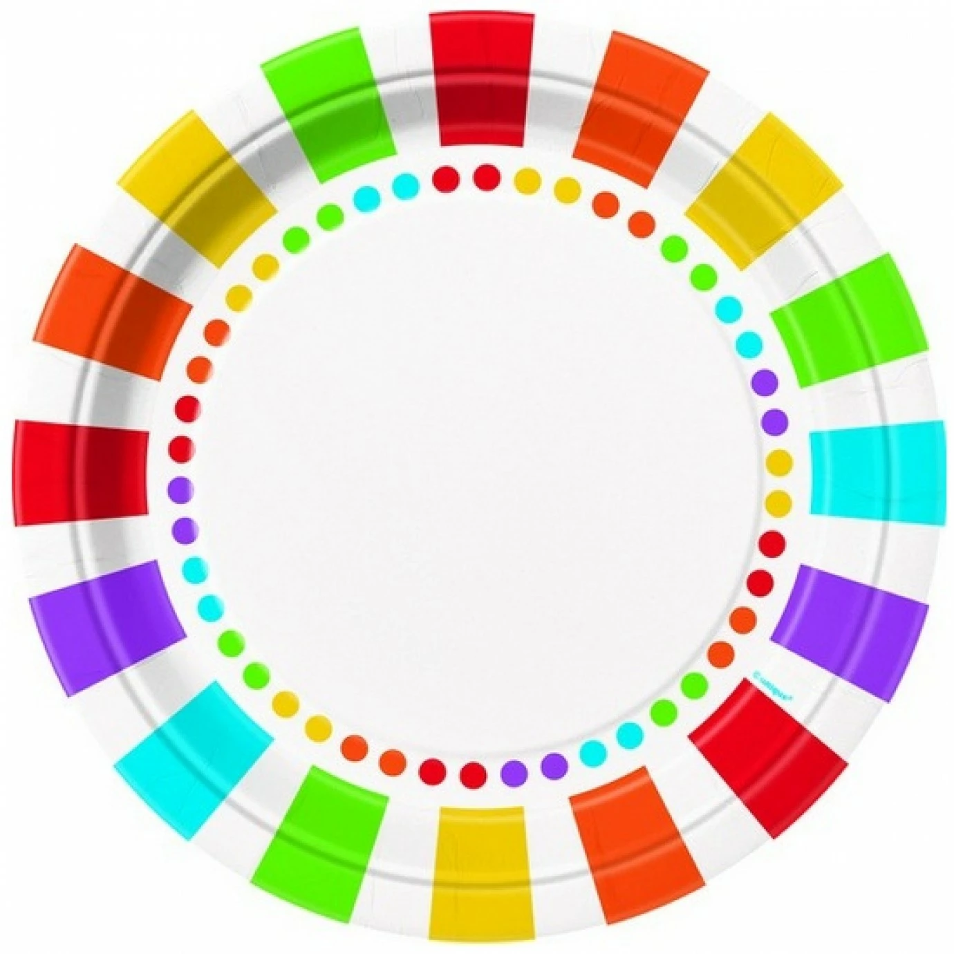 Pack contains 8 disposable dinner plates featuring a rainbow stripe and dot pattern with a white background.