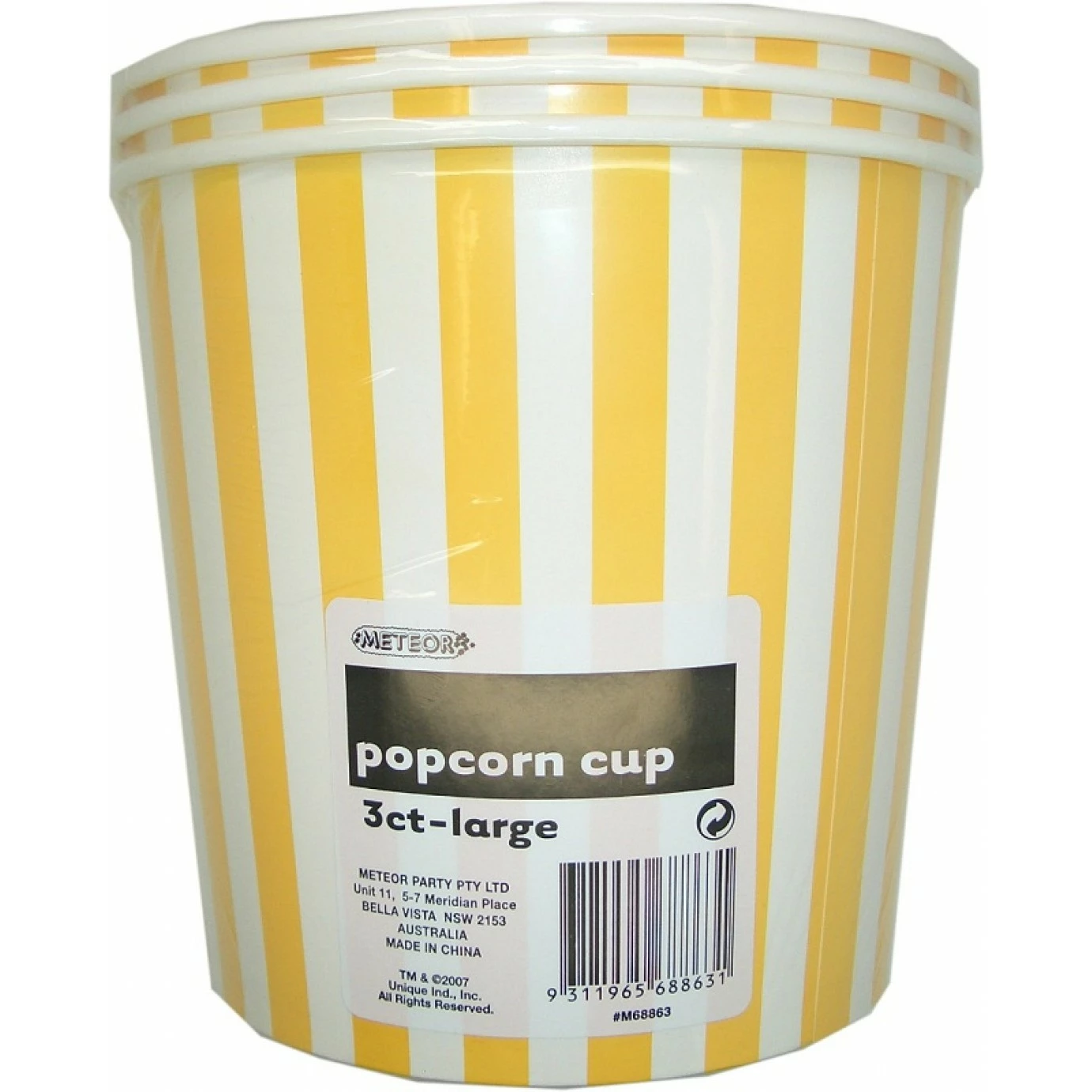 Pack contains three disposable cardboard popcorn buckets featuring a stripe design.