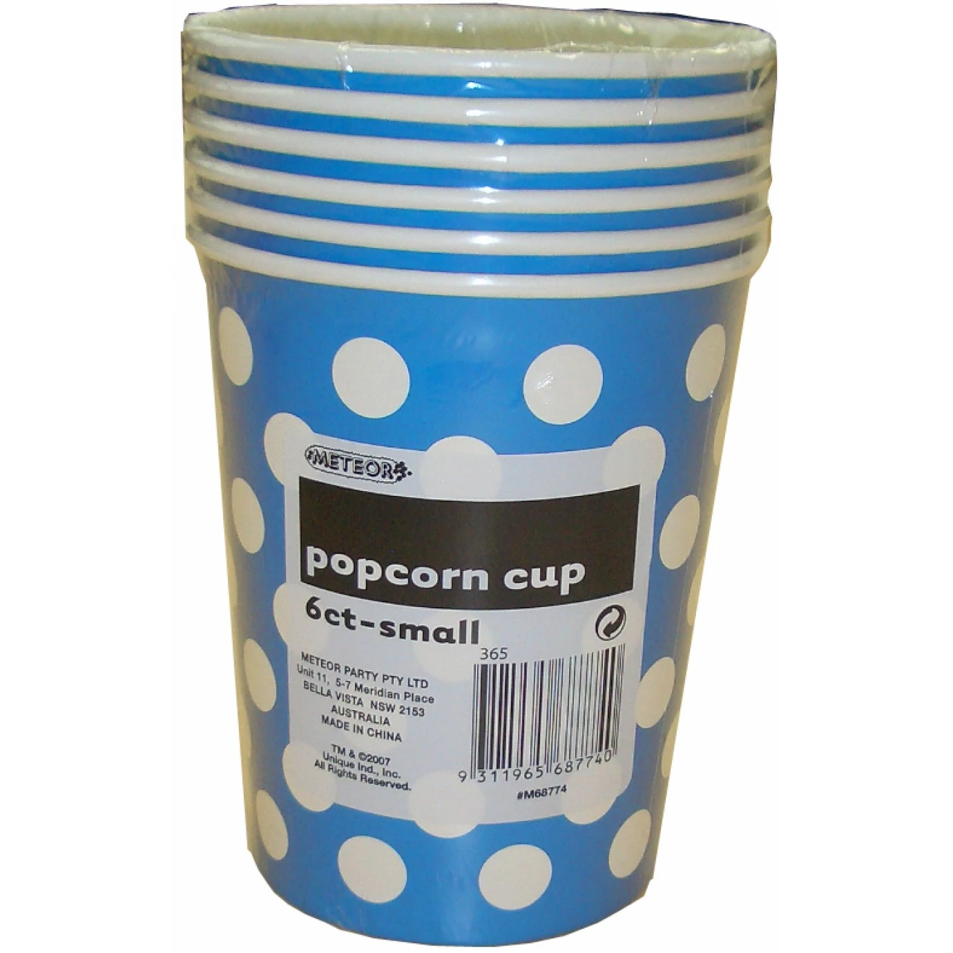 Pack contains six disposable cardboard popcorn cups featuring a stripe design.