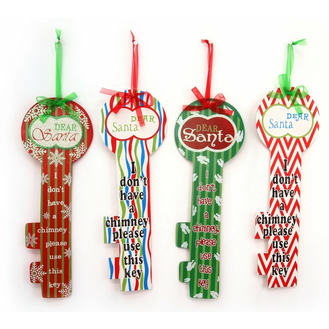These decorative key ornaments are made from wood and are attached to organza loops for easy hanging. Available in four colourful designs: Red/white, red/green, green/dark green and red/blue/white/green. All keys feature the words ‘Dear Santa, I don’t have a chimney please use this key.”