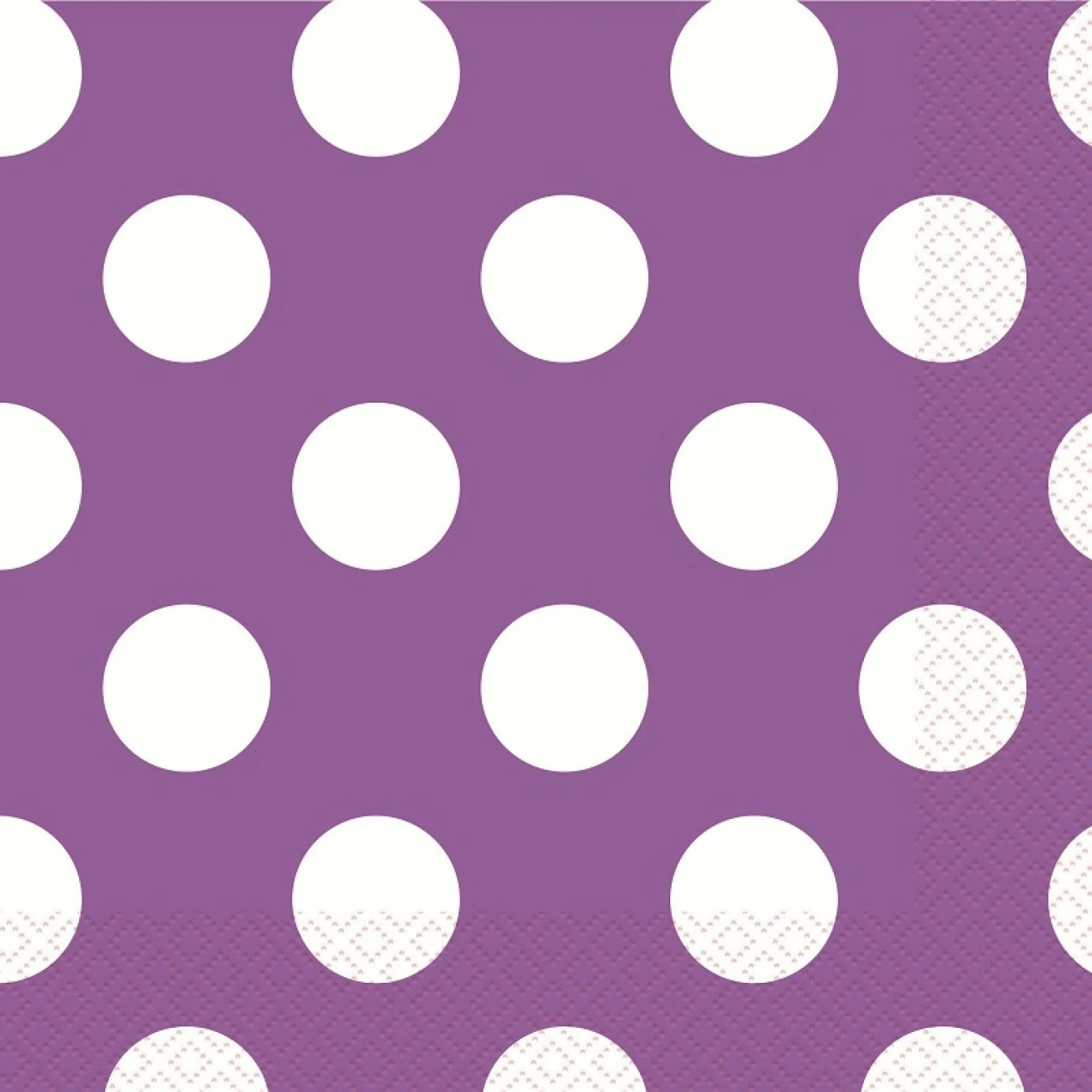 Luncheon sized serviettes in purple featuring large white polka dots.