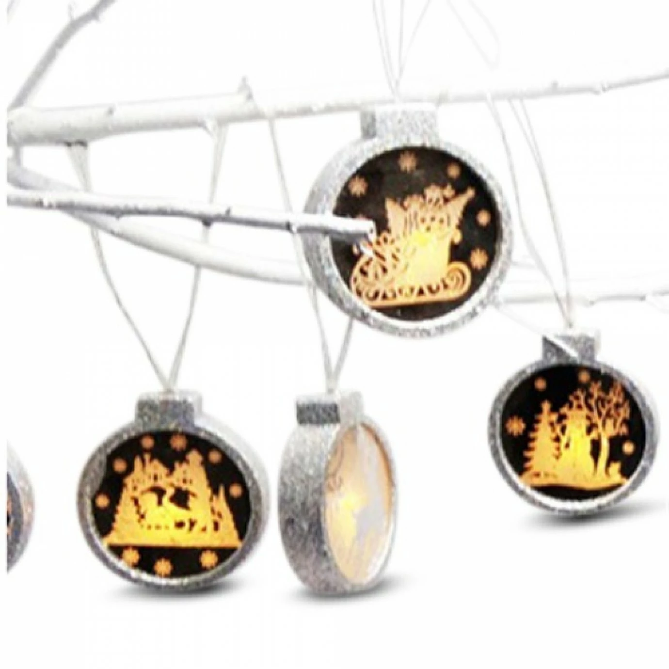These String lights are a warm white colour that shine behind assorted Christmas designs on each bauble.