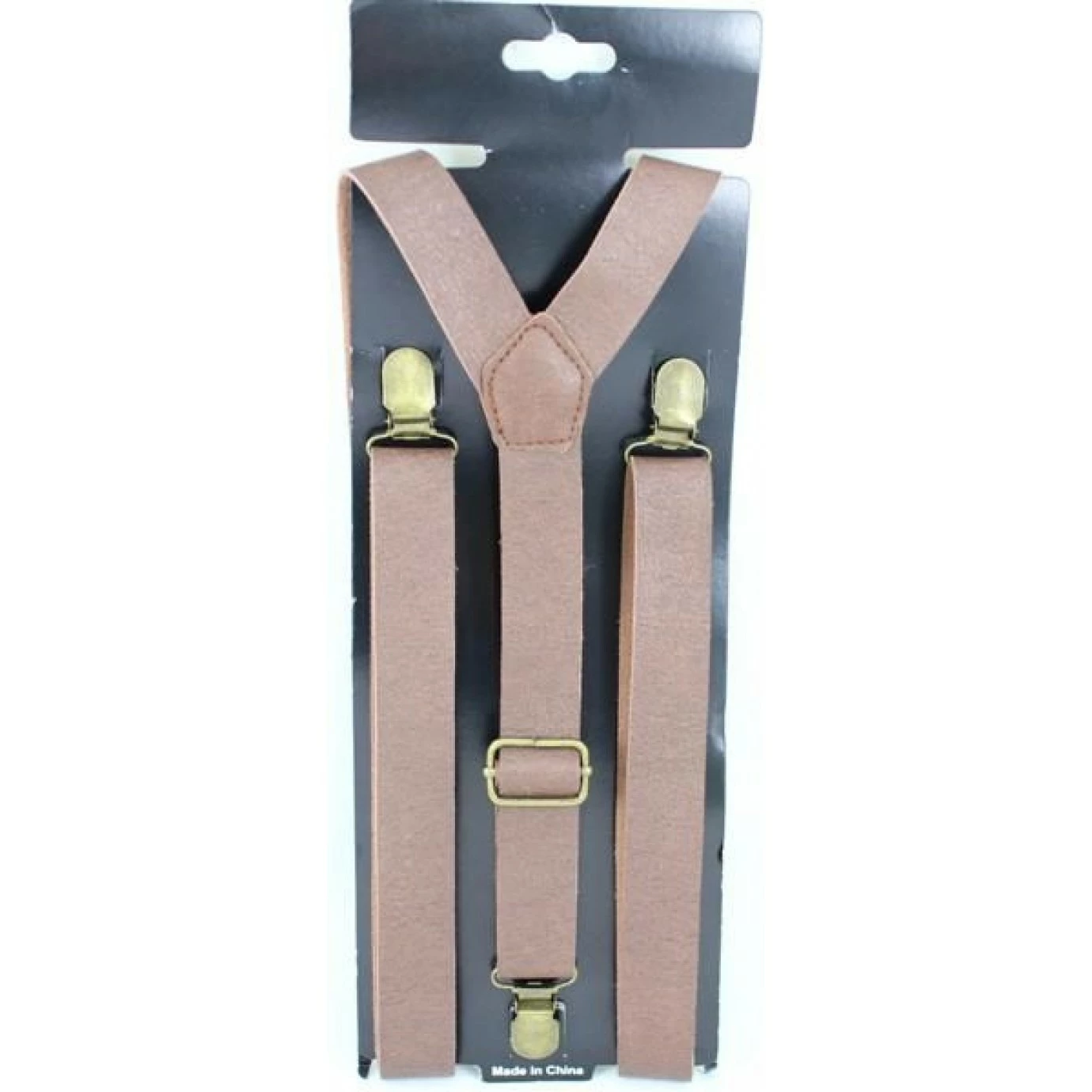 Suspenders are made from fabric with a leather look finish with metal buckles and clips. One size fits most adults.