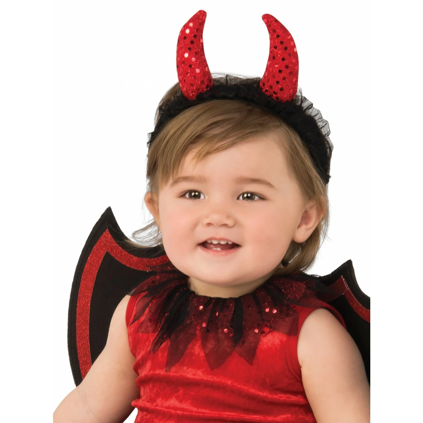 Costume includes dress with layered tulle skirt frills, soft polyester wing set with velcro attachment tabs, fabric headband with attached plush horns, and one pair of plain black tights.
