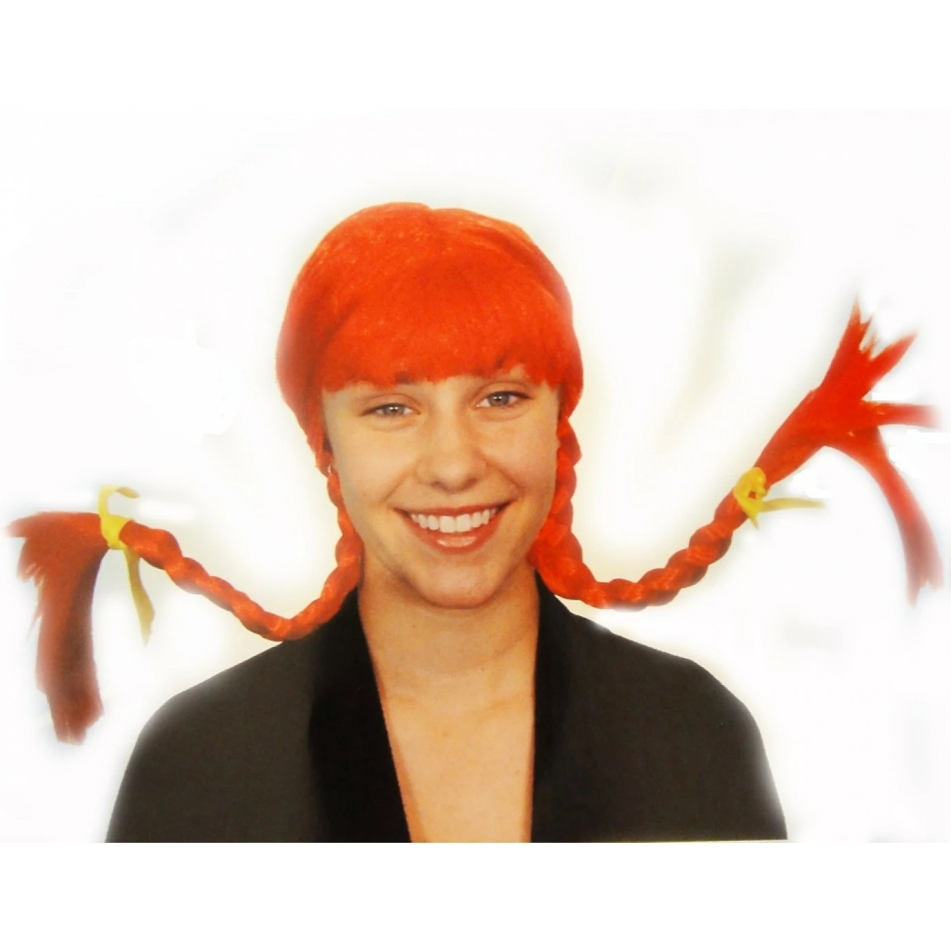 Synthetic hair which is styled with a fringe and two plaits, each plait has a ribbon tied to the end. Plaits can be positioned in any way you like!
